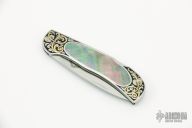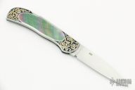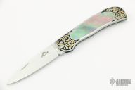This Interframe Lockback from Warren Osborne features a hand rub satin finished blade with nail nick. The handle is comprised of stainless steel with black lip pearl inlays. Handle has been engraved and has gold inlays. Includes a felt case. Has a couple light scratches, otherwise excellent condition. #025 on the blade.
