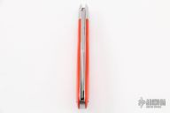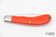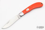 This Saddlehorn slipjoint by Jerry Halfrich features a hand rub satin finished blade with nail nick. Razor sharp. The handle has stainless steel bolsters with integral liners, orange linen micarta covers with a stainless steel shield escutcheon, stainless steel spring. Has half-stop, flush in all positions. comes with a zippered case. Has a few light scratches, otherwise excellent condition.