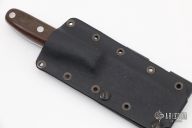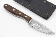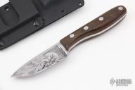 This knife features a Damascus steel blade made from a chain saw blade by Mel Harvey. The blade was then hollow ground and acid etched by Miles Martin with flowers on both sides, has a Rockwell of 59. 5/32" blade stock and 1" blade depth, full tapered tang construction. The handle is green canvas micarta with 4 stainless steel pins. Comes with a custom made kydex sheath with belt loops stamped "FF". Handle and sheath done by Flat Face Knives. Has scuffs and scratches, fair condition.