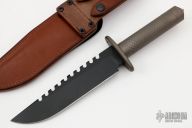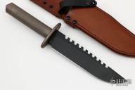 This Vigilante by Chad Nichols and Nottingham Tactical features a black cerakote blade with sawteeth on the spine, .258" blade stock and 1.750" blade depth, hidden tang construction. The handle has a tumbled and bronze anodized titanium guard and hollow handle with removable butt cap that has a compass. Comes with a brown leather sheath by Chatanooga Leather Works and original box. New from maker at the 2022 Blade Show Texas.