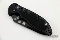 This C121PBK Embassy from Spyderco features a black sheepsfoot style blade with swedge, small thumbhole and notched thumb ramp. The handle has an aluminum frame with black G10 inlays. Lanyard hole in pommel. Reversible black coated stainless steel tip up clip. Blade is deployed via push button with fast coil spring action. Sliding safety on "A" side of handle. Has some light scuffs/scratches, otherwise excellent condition.