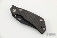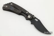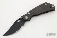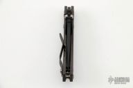 This PT Persian by Mick Strider features a black blade with notched thumbrest and thumbhole. The handle has a flame finished titanium frame with matching tip up clip. New condition.