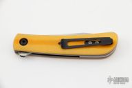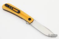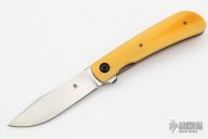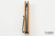 This Moose Skinner by Jason Clark features a hand rub satin finished blade with a notched flipper. The handle has micarta scales over titanium liners with a titanium tip pocket clip and a stainless steel backspacer.  Nice detent, lockup and blade seating. Comes with a leather slip sheath and COA. New from maker.