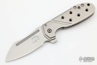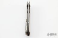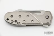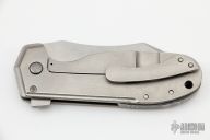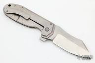 This H.S. Possum by Jason Stout and Jeremy Horton features a chisel ground and tumbled blade with a fuller and flipper. The handle has an orange peel finished titanium frame with matching tip up pocket clip and a Damascus backspacer. Nice detent, lockup and blade seating. Excellent condition.