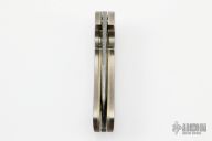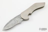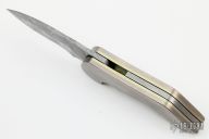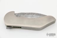 This Føniks "Hovin Framelock" Flipper by Glenn Are Hovin features a Damasteel blade with false top edge and flipper. The handle has orange peel finished titanium scales, anodized titanium liners with jeweled interiors, Damasteel floating backspacer, all hidden hardware. NO VISIBLE HARDWARE. Very strong detent, so strong that I cannot flip it, nice lockup and blade seating. Comes with zippered case. Has a couple small dings, a few light scratches, the detent is too strong, and difficult to close, otherwise good condition.