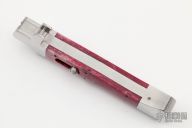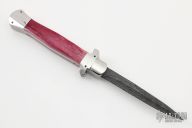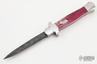 This Italian D/A OTF by Burn Knives features a Mike Norris raindrop Damascus double-edged blade. The handle has mirror polish finish stainless bolsters and Black Cherry colored giraffe bone scales. Nice action and lockup. Excellent condition. Comes with zipper case and COA dated 9-23-19.