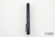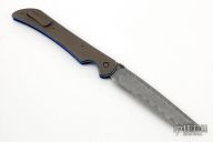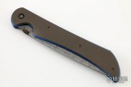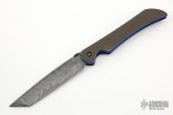This XL Stingray from Sal Manaro features a Damascus tanto blade with swedge and checkered anodized titanium thumb disc. The handle has textured and anodized titanium scales, anodized titanium liners, anodized titanium checkered backspacer, tip up clip with hidden screws. Smooth action. Nice blade seating, detent, and lockup. Excellent condition.