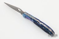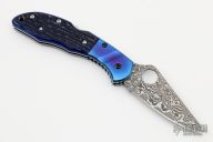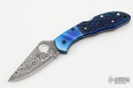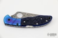 This Delica Lockback Folder has a Damascus VG-10 clip/ spear point blade with thumbhole and notched thumb ramp. The handle has l blue jigged bone scales with blue anodized titanium bolsters, stainless steel lock/ spacer, and fileworked stainless steel liners.  Excellent condition. Comes with Spyderco padded zipper case