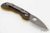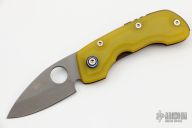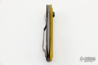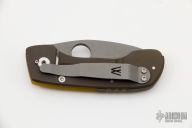 This Leafstorm framelock by Kevin Wilkins features a bead blast finished blade with thumbhole. The handle has a yellow translucent G-10 scale with black linen micarta backspacer, bead blasted titanium frame and tip up stainless steel clip. Nice detent, lockup and blade seating. Excellent condition. Comes with a velcro case. This model was later produced by Spyderco.