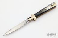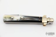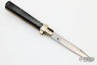This 10" Picklock Auto by Renzo Pascotto has a polished stainless steel spear point blade with false top edge. Handle is buffalo horn with brass bolsters, brass liners, brass pins, stainless steel back spacer, and safety. Blade and bolsters have some light scuffs/scratches, excellent condition otherwise.