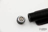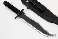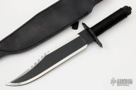 This knife features a two-tone blade with black center and satin finished grinds, 14 saw-teeth on blade spine and sharpened top edge, .258" blade stock and 1.825" blade depth, hidden tang construction. The handle has a black stainless steel double guard with flat and Phillips head screwdrivers, hollow cord wrapped handle, and aluminum removable butt cap with a compass and an O-ring to make it waterproof. Comes with black leather sheath with a diamond sharpener in the sheath and a Lile zippered case. Designed by Jimmy Lile and made by Vaughn Neeley. New From Maker!
