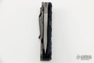This Zulu by Jens Anso features a bead blast finished blade with swedge and thumbhole. The handle is comprised of a carved black/blue G-10 scale and backspacer with bead blast finish frame, matching tip down clip, lanyard hole in pommel. Comes with a zippered case. Excellent condition.
