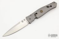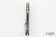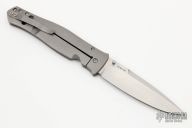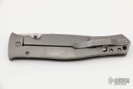 This Dr. Death is a flipper by Tom Mayo. The Dr. Death flipper has very smooth action and good detent, lockup and blade seating. Bead blasted titanium frame with MOA hole accents .357 magnum shell inlay, standoffs, lanyard hole. The blade is hand rub satin finished with flipper. Comes with a zippered case. Has some scratches on the clip and frame otherwise great condition.