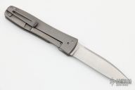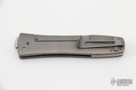 This Flipper by Jason Clark features a tumbled blade with a notched flipper tab. The handle has linen micarta scales over titanium liners with a matching tip up pocket clip and stainless steel backspacer.  Fat carbon pivot collar. Nice detent, lockup and blade seating. Comes with a leather slip sheath and COA. New from maker!