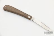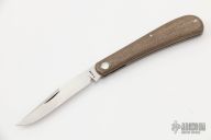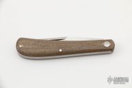This slipjoint by Reese Bose features a stain finished blade with false top edge and nail nick. Has half stop. Brown micarta scales, stainless steel liners and backspacer. Flush lockup and centered blade. Comes with a soft pouch. Has some light scratches, otherwise great condition.