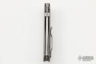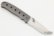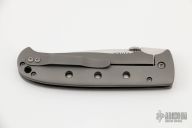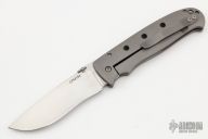 This Full Custom One of a Kind Framelock by Tom Mayo was built on the TMX profile, it features a hand rub satin finished blade with notched thumbramp and thumbdisc. The handle has a bead blasted titanium frame with hole pattern and tip down clip. 25 year anniversary logo. Nice detent, lockup and blade seating. Comes with a soft pouch. Very smooth action. Has a couple light scratches on the handle, otherwise Excellent Condition.