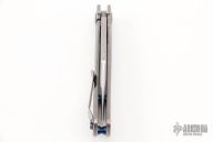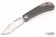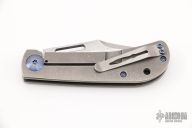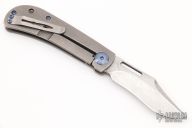 This Rebel Framelock from Jim Burke has a Damascus blade with swedge and thumb hole. The handle has tumbled titanium scales with carbon fiber inlay, anodized titanium pivot, barrel spacers, and a tumbled titanium tip up clip. Lanyard hole in pommel. Includes a zippered case. Nice detent, lockup and blade seating. Excellent condition.