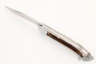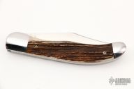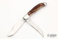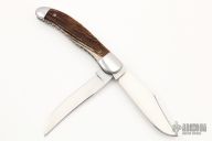 This 2-Blade Large Hunter Prototype by Mike Rothman features hand rub satin finished blades with nail nicks. The handle has mirror polished 416 stainless steel bolsters, red stag covers, fileworked 410 stainless steel liners, and CPM154 springs. Has half-stops, flush in all positions. Comes with zippered case and COA dated 3/12/22. New from maker!