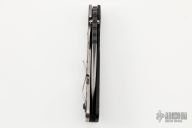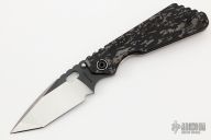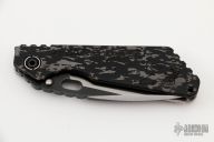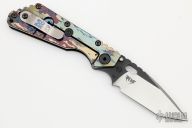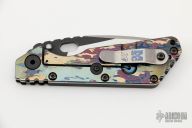 This SMF by Mick Strider features a blade with notched thumbrest and thumbhole. The blade has been reground by Danny Yard of Rip Knives. The handle has an aluminum and titanium frame, with tip up titanium clip. Handle finish is "A-Tacs Camo". Nice detent, lockup and blade seating. Has a few light scuffs on the blade, otherwise excellent condition.