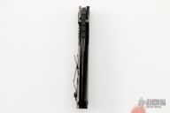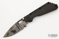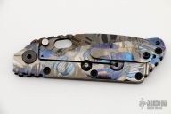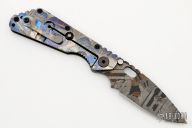 This Mick Strider custom SMF framelock folder features a laser engraved blade with a spear point grind, notched thumbrest, dual thumbstuds and a thumbhole. The handle has a carbon fiber front scale, and a laser engraved titanium lockside with matching titanium clip, tip up carry. Jimping on blade spine. Includes Hinderer "Lock Bar Stabilizer" for maximum reverse lock retention. Nice blade seating, lockup and detent. Excellent condition. Comes with a velcro case.