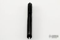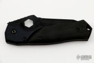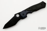 A tactical folder designed by Steve Ryan. Partially serrated edge. Top edge is sharpened 3/4" from the point. Chisel grind. Black chromed finish on blade. Black G10 scales. Black bolsters and liners. Specially design thumb hole fits a standard 0.5" hex scope nut. Excellent condition. Comes with a velcro belt sheath.