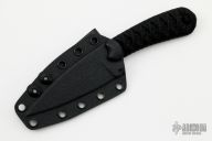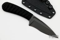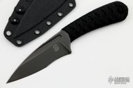 This SIN by Bastinelli Knives features a black recurve blade with notched thumbrest and fullers, .136" blade stock and 1.15" blade depth, full tang construction. The handle has a custom black cord wrap. Comes with kydex sheath and zippered case. New from maker!