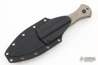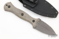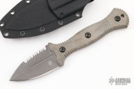 The Telum by Bastinelli Knives features a double edge blade with partial serrations and a mortise tang construction.  .126" Blade Stock.  1.349" Blade Depth.  The handle features green canvas micarta scales. Includes a kydex sheath with a Tracker Dan clip and display case. New From Maker!