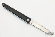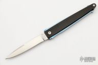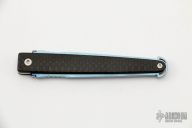 This Funny Folder by Hans Weinmueller features a hand rub satin finished blade with false top edge. The handle has carbon fiber scales with an anodized an fileworked titanium frame. Comes with a black leather slip sheath. Excellent condition.