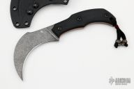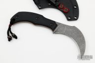This Tripovan by Bastinelli Creations features a heavy tumbled hawkbill style blade with a full tang construction and notched thumbrest.  .139" Blade Stock.  1.163" Blade Depth.  The handle has G-10 scales.  Includes a black kydex sheath with a display case.  New from maker!