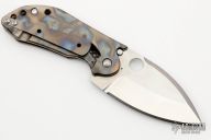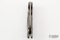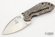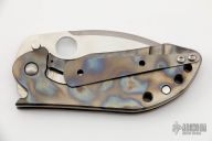 This framelock flipper by Steve Ryan features a satin finish spear point blade with false top edge and a thumbhole. The handle has a flamed titanium frame with a matching tip up titanium clip. Nice detent, blade seating and lockup. Excellent condition.