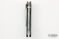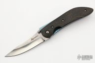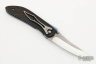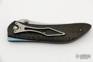 This knife by Allen Elishewitz features a satin finished blade with dual thumbstuds. The handle has carbon fiber scales with copper inlays, anodized titanium liners and tip down stainless steel clip. Nice detent, lockup and blade seating. Excellent condition.