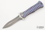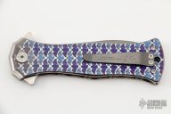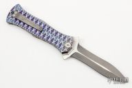 This Twist Tighe button lock flipper by Brian Tighe features a milled two=tone finished spear point blade with a flipper. The handle has a milled and anodized titanium frame with a titanium tip up clip. Lanyard hole in pommel. Excellent condition.