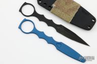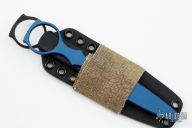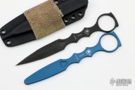 "The Spartan CQB tool is aptly named and specially designed for Close Quarters Battle. The CQB tool is a ring dagger with a kydex sheath. The sheath compliments the ring on the end the knife for quick removal. The sheath is designed to lash into MOLLE /PALS behind magazine or other front pouches on a vest or be carried on belt or inside the waist band. The design concept of the CQB tool originates with Greg Thompson, an instructor of close quarters fighting techniques (Hand To Hand) for the US Special Forces. Mr. Thompson is owner / founder of the H2H/Team ROC of the Fort Bragg based training group and developer of the Special Operations Combatives Program (SOCP). Mr. Thompson developed the new combatives program for US Army Special Operations Forces and this CQB tool is part of program gear. The CQB Tool or "transition tool" is used to compliment this program by providing a slim easily stowed knife with rapid aquisition for, "get the heck off me", grappeling situations encountered in a CQB fight. The ring and slim profile design allows for the operator to quickly pull and utilize the dagger; breaking an attackers grasp and allowing the soldier to transition back to his primary weapon system without resheathing until safe to do so." This CQB Tool has black coating (SpartaCoat - PVD - Tungsten DLC) and a black Kydex sheath. Has some light sheath marks, otherwise excellent condition. Comes with Trainer blade.