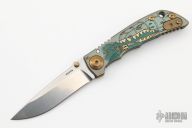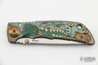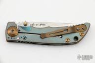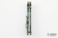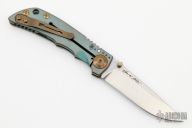 This Harsey framelock folder by Spartan Blades features a stonewashed S45VN drop point blade with dual thumbstuds and a notched thumbrest. The handle has an anodized titanium frame with a laser engraving a tip up titanium clip and filler tab. Has nice detent, lockup, and blade seating. Comes with original box. Excellent condition.