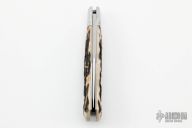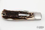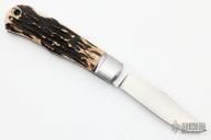 This Lockback by Jim Dunlap features a hand rub satin finished blade with nail nick. The handle has stainless steel fluted bolsters, stag scales with stainless steel escutcheon, stainless steel liners and spring. Comes with a zippered case. New from maker!