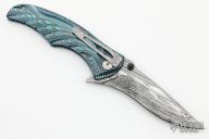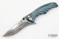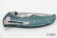 This Tighe Coon button lock flipper from Brian Tighe features a Damasteel blade with dual thumbstuds and a flipper. The handle is comprised of a machined black Timascus frame over a single barrel spacer, textured titanium tip down clip. Great blade seating, detent and lock up. Excellent condition.