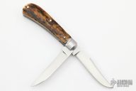 This 2 blade trapper by Jim Dunlap features two hand rub satin finished blade both with nail nicks. The handle has pinched and fluted stainless steel bolsters, mammoth covers with a stainless steel shield escutcheon. Has half stops, flush in all positions. Comes with a zippered case. New from maker.