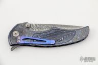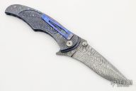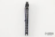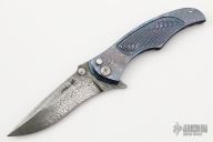 This Tighe Coon button lock flipper from Brian Tighe features a Damasteel blade with dual thumbstuds and a flipper. The handle is comprised of a machined black Timascus frame over a single barrel spacer, textured and anodized titanium tip down clip. Great blade seating, detent and lock up. Excellent condition.