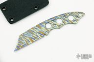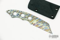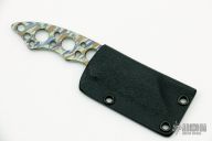 This neck knife by Les Voorhies features a chisel ground blade with orange peel finish and multi-color anodizing, .089" blade stock and .835" blade depth, full tang construction. Comes with a kydex sheath. Excellent condition.