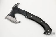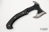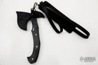 This San-Mai Hand Axe by the Sobral Brothers features a hammer mark finished black blade head with spike at the rear, stainless steel fittings, carbon fiber scales. Full tang construction .286" stock and 1.70" blade depth. 5.25" from blade to tip of spike. 11.25" overall. Comes with a leather sheath with shoulder rig. Comes with zippered case. New from Maker!