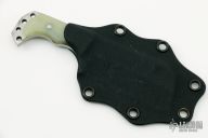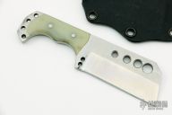 This mini cleaver from Mark Terrell features a satin finished blade and translucent G-10 scales, .177" blade stock and 1.329" blade depth, full tang construction. Comes with a black kydex sheath. Excellent condition.