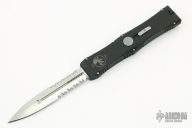 This Nemesis OTF automatic by Microtech opens via the automatic push button. Closes by disengaging the leaf lock and pulling the reverse charging handle in the rear of the frame. Contoured frame grip with milled ribbing on the frame spine and belly. S/N 552 and dated 1/99. Brend hand rub satin finished double edged partially serrated blade. Comes with original sheath and papers. Excellent condition.