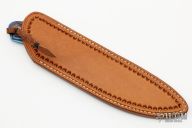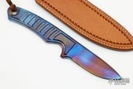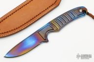 This hunter by Kevin Wilkins is made from one piece of anodized titanium, .119" blade stock and 1.159" blade depth. Comes with a hand tooled brown leather sheath. Excellent condition.