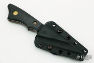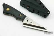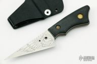 This Kiridashi by Rick Lala, it features a satin finished chisel ground S30V blade with notched thumbrest, .181" blade stock and 1.174" blade depth, hidden/mortise tang construction. The handle has black G-10 scales with stingray skin inlays, white and black liners and a natural paper micarta frame, lanyard hole. Comes with a kydex sheath with an option belt loop. Excellent condition. The reverse side of the blade has been carved by Rudy Lala.