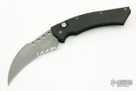 This Hawk Auto from Microtech has a bead blasted partially serrated hawkbill blade. Handle is black anodized aluminum with bead blasted titanium tip down clip. Action is quick and strong. Excellent condition. S/N 347. Dated 9/96. Comes with zippered case. Excellent condition.