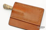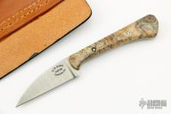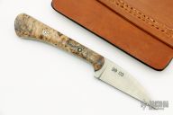 This knife by RW Clark features a satin finished blade with .120" blade stock and .789" blade depth, full tang construction. The handle has spalted maple burl scales with mosaic pins. Comes with a brown leather sheath. Excellent condition. "99 03" on the blade.