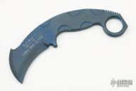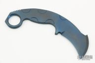 This Karambit by Eddie Baca is a Liong Mah design, it is made from one piece of anodized titanium, notched thumbrest, milled reliefs, ring at the butt, .283" blade stock and 1.395" blade depth. Has a couple light scuffs, otherwise excellent condition.