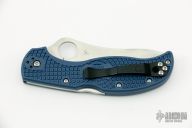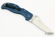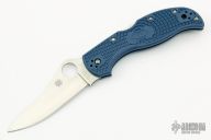 This Stretch lock back folding knife by Spyderco features a ZDP-189 satin finish blade with a thumbhole and notched thumbrest. The handle has a blue FRN frame and a 4-way reversible stainless steel clip. Include original box and papers. Excellent condition.