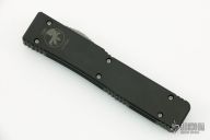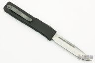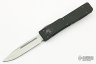 This Ultratech OTF automatic from Microtech features a satin finish single edge blade with swedge and fullers. The handle has a black anodized aluminum handle with stainless steel thumb slide and tip down clip. Dated 02/2002 with a serial number of 2295. Includes padded velcro case and original box and papers. Has a couple light scuffs on the frame, otherwise Excellent condition.