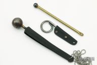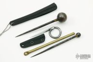 These custom spikes were made by Fred Perrin. The large one features an old file spike that has been ground to a point, .195" stock with a 4.25" spike. The handle is made of steel. Comes with a kydex sheath. The middle size one features a triangle ground steel spike, .175" stock and 4.75" spike. The handle is steel. Comes with a brass tube sheath, but it is not snug. The small one has a square ground point with a ring handle. Comes with a kydex sheath. All in excellent condition.